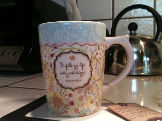 The mug is so sweet. It also has a nice flower print. And it has an ergonomic handle. My favorite is the inside, because there’s a lovely butterfly printed at the bottom that you get to see when you’re done with your coffee. And it says “He fills my life with good things”, Psalm 103:5.